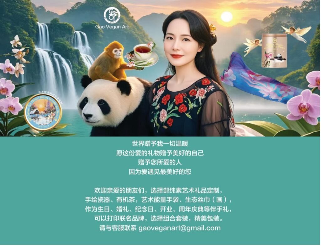 Dear friend welcome to choose Gao Vegan Art for customized gifts. We offer hand-painted porcelain, organic tea, artistic energy handbags, and eco-friendly silk scarves (with paintings) for birthdays, weddings, anniversaries, grand openings, and anniversary celebrations. We can also print co-branded pieces and choose from combination sets with beautiful packaging. Please contact customer service gaoveganart@gmail.com